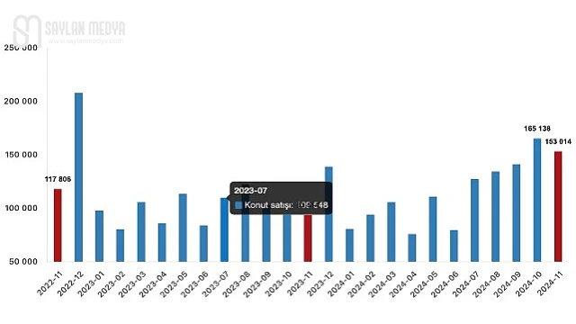 Konut satışları Ocak-Kasım döneminde bir önceki yılın aynı dönemine göre %16,4 oranında artarak 1 milyon 265 bin 388 olarak gerçekleşti.