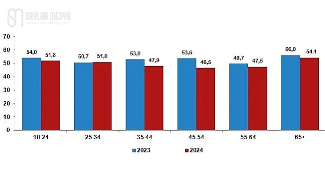 Mutluluk oranı 25-34 yaş grubu haricinde diğer tüm gruplarda azaldı. Mutluluk oranının en fazla azaldığı yaş grubu 7,1 puan azalış ile 45-54 yaş grubunda oldu. Bu yaş grubunda 2023 yılında %53,6 olan mutluluk oranı 2024 yılında %46,5 oldu. Mutluluk oranı 55-64 yaş grubunda bir önceki yıla göre 2,2 puan azalarak %47,5 olarak tahmin edildi. 65 ve daha yukarı yaştaki bireylerde ise 2023 yılında %56,0 iken 2024 yılında 1,9 puan azalarak %54,1 oldu.